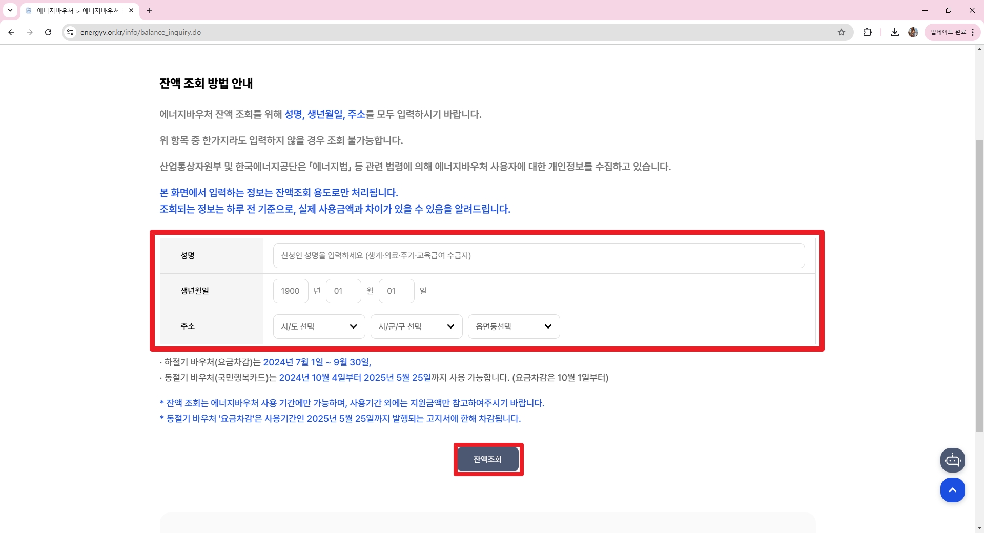 에너지바우처 간편잔액조회에서 이름, 생년월일, 주소를 입력하세요.
